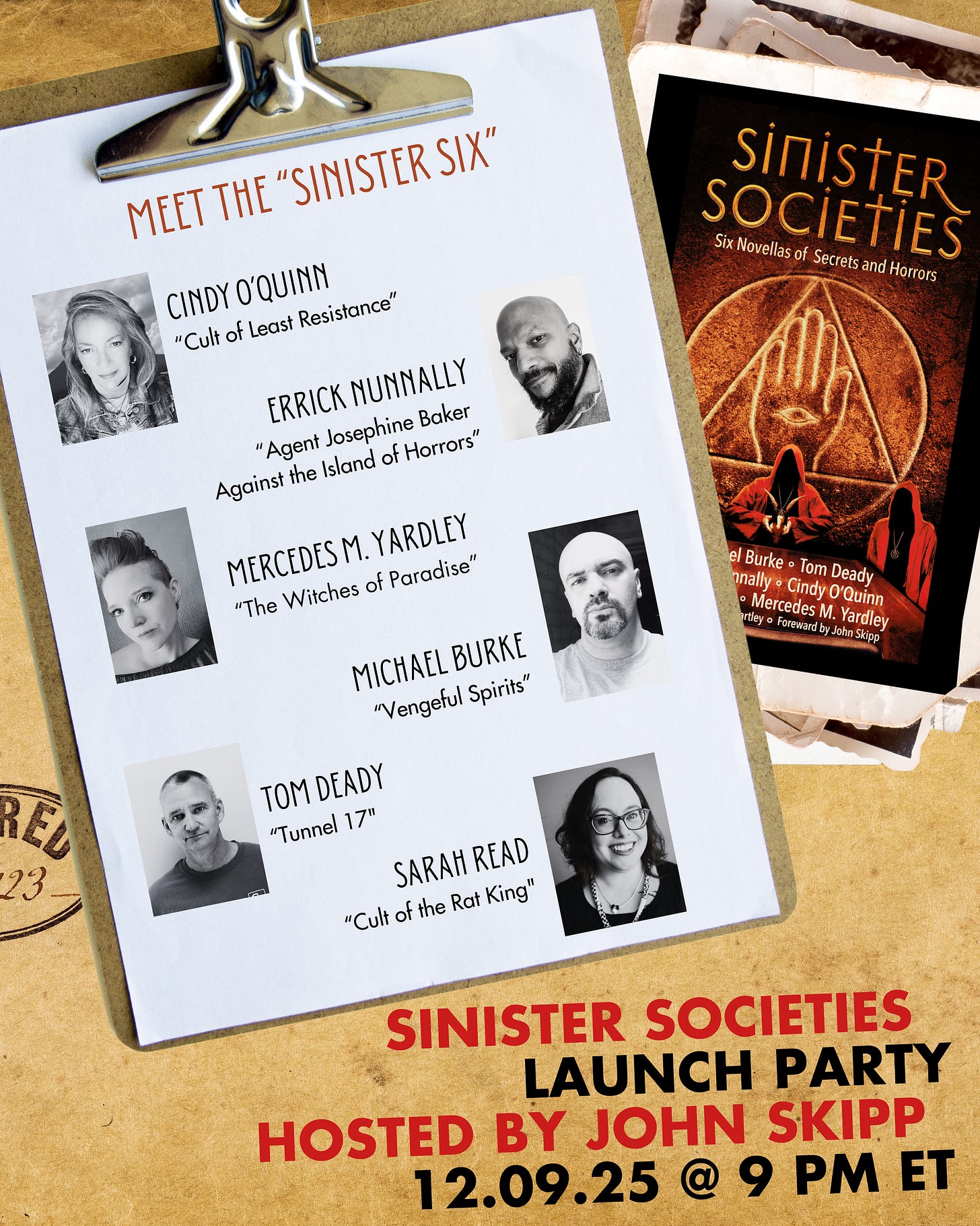 And on this coming Tuesday, December 9th, I’ll be hosting the online launch party for Sinister Societies, a new compilation of six far-flung and stunningly-diverse novellas, which I suspect you may also enjoy like crazy.